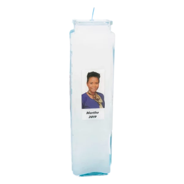 Bougie de mémoire avec la photo du défunt, son nom, prénom et l’année de décès.